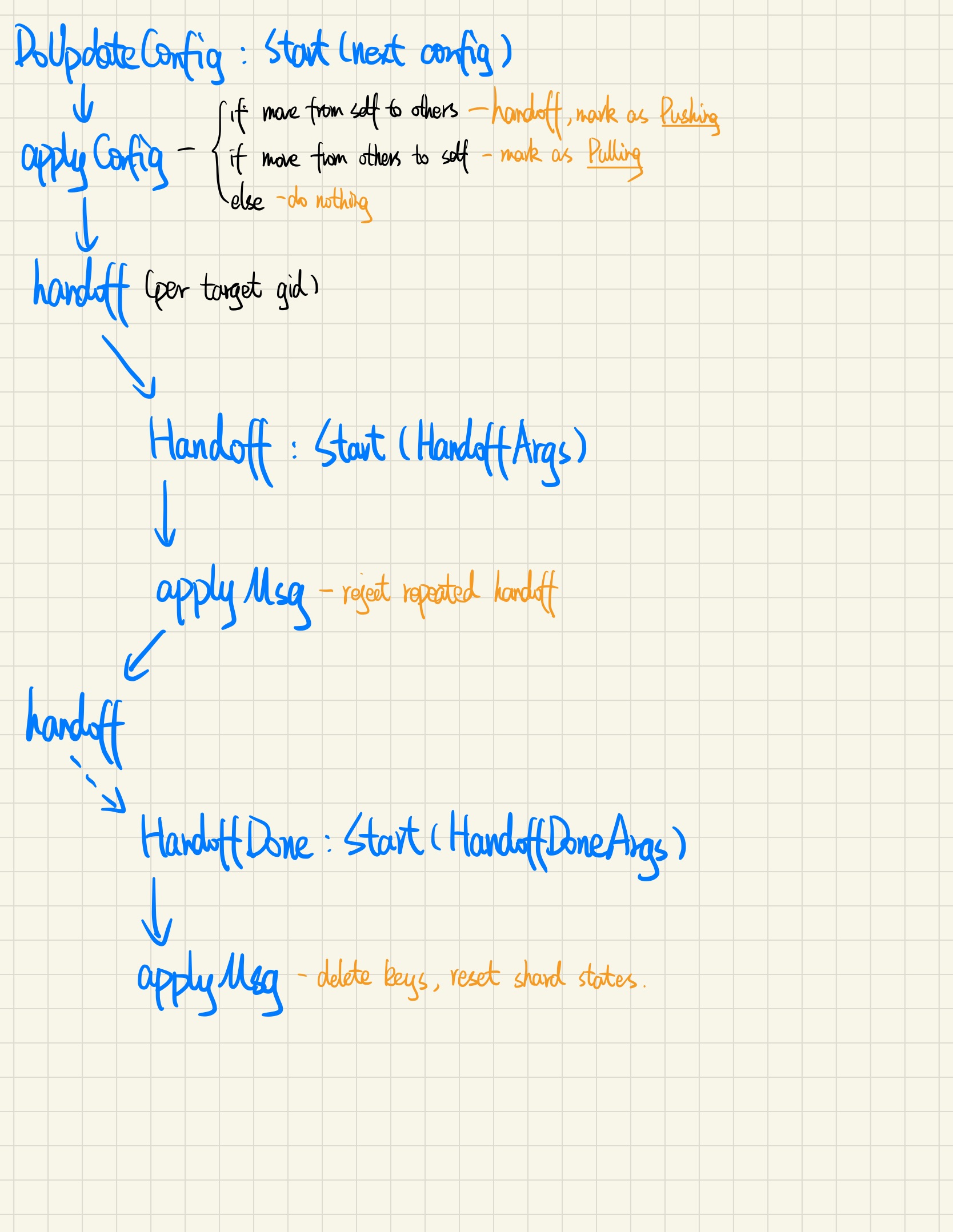 Start。对应图中HandoffDone。 - 分片恢复服务:包括 Leader 在内的每个节点的 applier 循环接收自 Raft 层推送的配置更新完成消息,清理对应的 key(Lab 4 Challenge 1)并将这些切片恢复到正常状态,为下一轮 reconfiguration 做准备。对应图中第二个