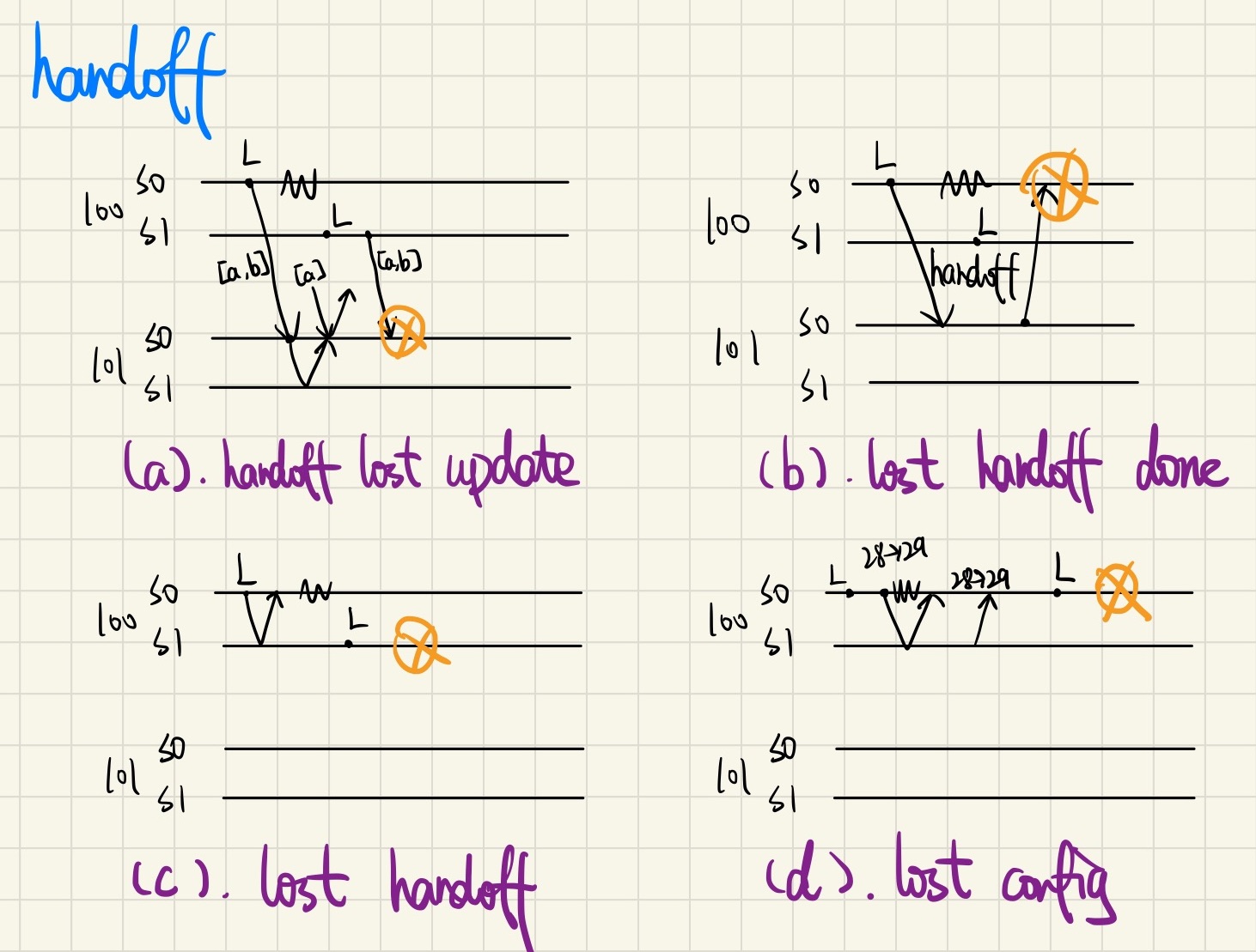 ClientId时才行得通。我并没有使用这种方法(或许这样做会更简单,欢迎尝试了这种方法的读者在评论区指出其优劣)。我的解决方法是在应用状态前增加两下检查:首先检查在移交的分片对应本地状态中,是不是有Pulling状态的分片,如果没有则明显说明这是一个重复的移交。然而这样做并不足够,因为在目标组收到重复移交之前可能已经进行了下一轮 reconfiguration,所以还需要检查HandoffArgs.Num是否是最新的。b. lost handoff done