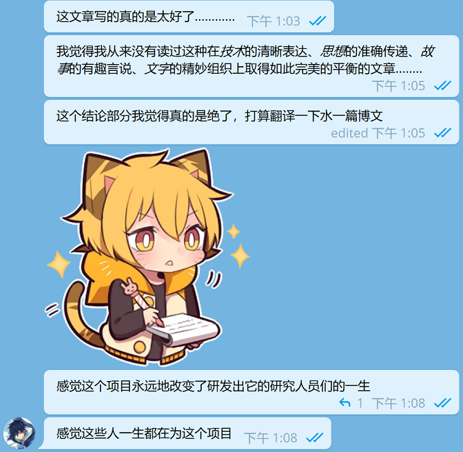 我将要引用并翻译的段落出自论文的倒数第二节 “8. Conclusion”(8. 结论) 。在读完全文后,我在我的私人群里如此表达我的感受: